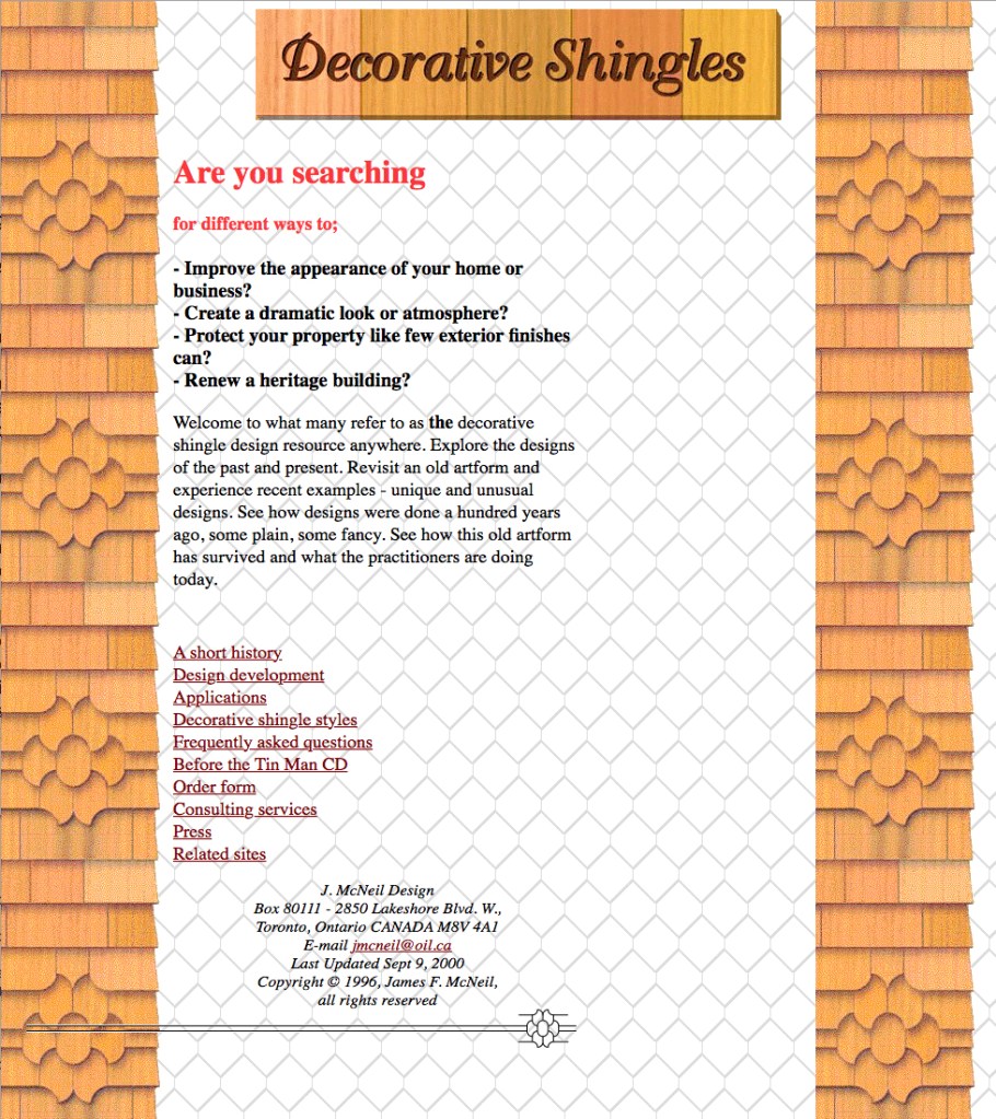 Decorative Shingles‘ first web site happened in 1995 but was under a different URL It was experimental. it was the age of blazing fast 14.4 kb/s telephone modems (complete with dial tones and handshakes). It was actually a struggle to be connected and keep connected back then. Decorativeshingles.com got it’s URL birth back in 1999. It was intended to be an informational site which also eventually supported the marketing and sale of “Before the Tin Man V1”. Like many first versions – it suffered from a few technical issues, & was pulled from the “shelves” and eventually replaced by the V2.0 released in 2002.. The web site stayed active until 2015 when “Before the Tin Man” became out of print and CDs had seen their day.