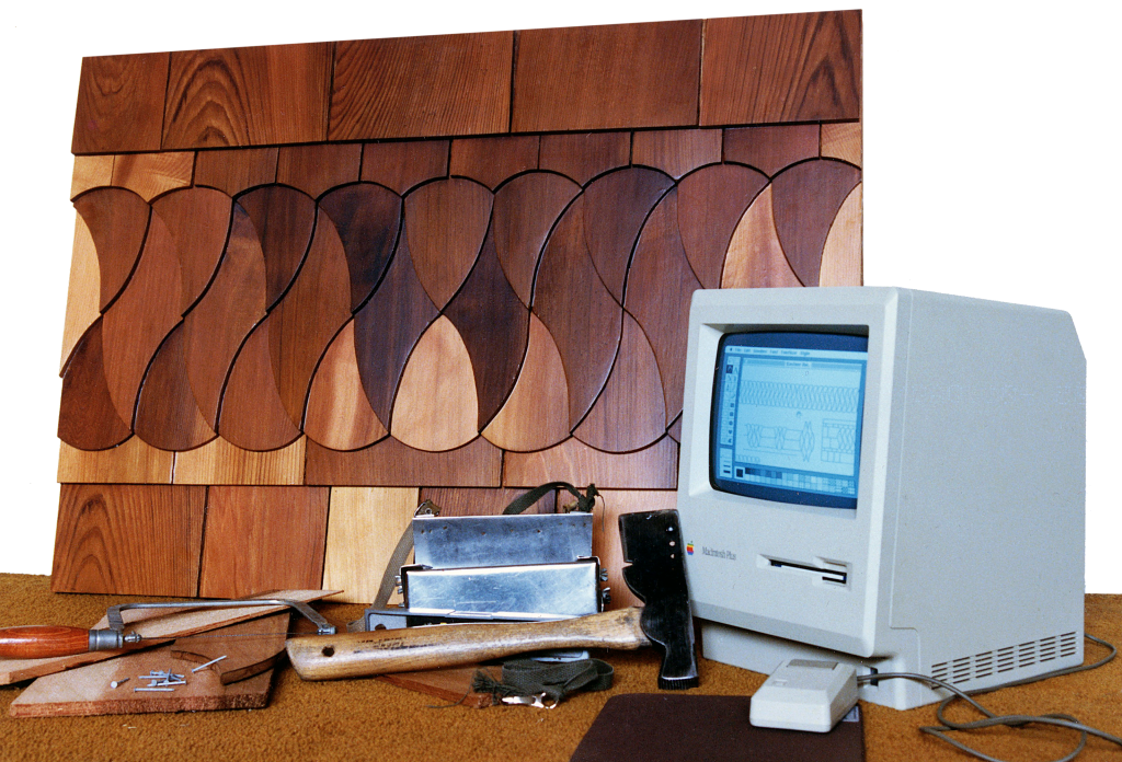 This high powered computer – a Mac Plus, was THE upgrade from our original 128k Mac. This one helped in the design of the Tulip/Kastner Rope pattern in the background. Note the advanced, stainless steel nail stripper, hatchet and scroll saw – all state of the art and advanced tech in 1987.